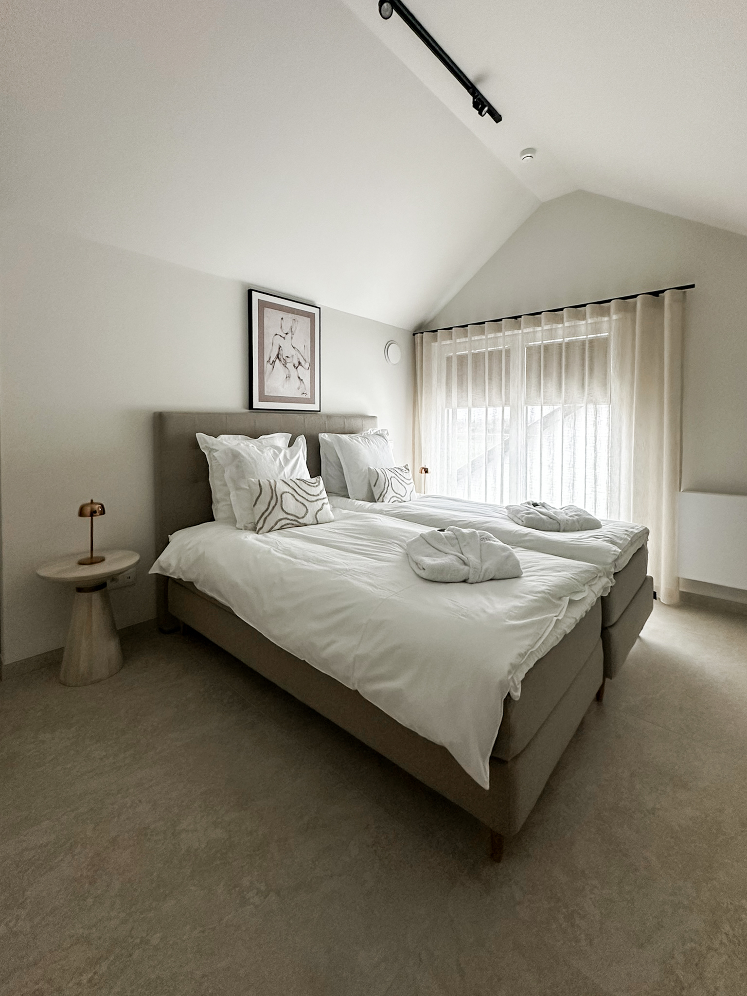 Verder zijn er 4 volwaardige slaapkamers met telkens 2 bedden dan 90 cm die van elkaar geschoven kunnen worden alsook als één bed kunnen gebruikt worden. Dan is er nog één slaapbank waar je met twee ( wel knus ) in de ontspanningsruimte met telkens op elke slaapkamer een tv en bureau en ruime kasten.